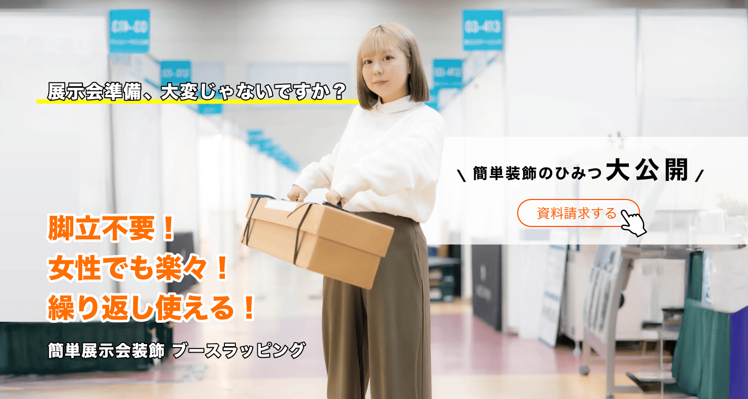ブースラッピングは筒状にくるくる巻いて、専用箱「ポータブルBOX」に収納できます。1箱にブース1小間分(3m✕3mサイズ)壁面クロス9枚までが収納できて、重さは約10kg。女性でも持ち運び出来ます!